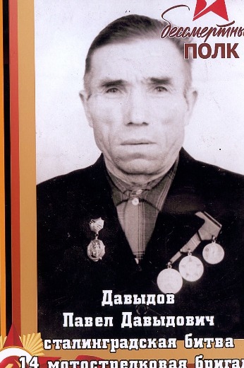Давыдов Павел Давыдович, из села Хозесаново Кайбицкого района ТАССР, уехал работать в город Казань. Там и был призван на войну. Воевал под Сталинградом, был пулеметчиком 1, участвовал в освобождении города Калач. 28 ноября 1942 года был тяжело ранен при взятии д. Сокаревка Калачевского р-на. Павла Давыдовича считали погибшим. Мать Евдокия Дмитриевна получила похоронку. Долго лежал в госпитале. После госпиталя воевал на Украине. Четырежды был ранен. Последнее ранение - потеря левого легкого.Летом 1944 года вернулся домой. Несмотря на инвалидность, тяжелые ранения сел за трактор. Пахал землю,сеял хлеб для фронта, для страны. Последние годы Павел Давыдович очень болел,тяжелые ранения давали о себе знать. 22 октября 1982 года нашего папы не стало, ему было всего 60.