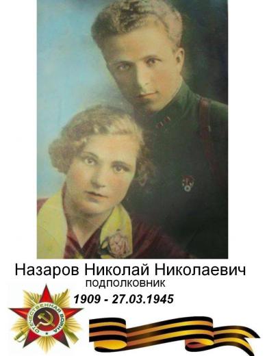 Дедушка Назаров Николай Николаевич, 1909 года рождения, погиб в марте 1945 года и был похоронен 27 марта 1945 в городе Капошвар Венгрия .После путча /1956/ в Венгрии могилы советских воинов были разрушены и уничтожены, останки дедушки были снова перезахоронены в братскую могилу 392.... Гвардии майор Назаров Н.Н., посмертно было присвоено звание подполковник, как говорила моя мама, его дочь.... И моя бабушка - Назарова Александра Николаевна, умерла в 1969 году от рака.... Самое интересное то, что , когда моя бабушка осталась одна с тремя детьми на руках и долею судьбы ее привело в город Болград, где не было квартиры, ведь они были беженцы....а дедушка погиб, то она отправилась в Москву и смогла попасть на прием к Ворошилову и потребовала, чтобы ей, как вдове погибшего офицера с детьми, дали квартиру... и ,пока она доехала в Болград, ее уже ждала квартира... вот такая была бабушка.....Назарова Александра Николаевна .. Дедушка Назаров Николай Николаевич родом из города Выкса Горьковской области... владел китайским, японским языками в силу рода своей службы Бабушка Назарова Александра Николаевна из города Витебск Белоруссия Род моей мамы Джеммы Николаевны идет еще из села Ризы, из обедневшего рода дворян