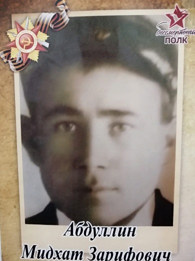 В 1940 году Абдуллин МИдхат был призван в армию. 18 парней из село Калтасы попали на Дальний Восток, только 3 их них вернулись домой. Сразу после карантина Мидхад попадает в полковую школу, где готовят младших командиров. Школу закончил на отлично, полил звание младшего сержанта службы связи. В июня 1941 начинается война, а на Дальнем Востоке, где служил Мидхат, делают вылазки японцы. Мидхат уходит добровольцем на фронт. В начале 1942 года солдат его части начали отправлять на Запад. В конце февраля 600 человек высали недалеко от Ростова на Дону и молодым бойцам сразу пришлось принять бой. Неопытных ребят фашисты били на прицел, осталось только 10 человек! Целых полгода немцы держали кольцо. Холод,голод, ни пищи ни воды. Только лишь поражение фашистов под Сталинградом освободило дивизию, укрытую в Шабановском перевале..Довелось Абдуллину Мидхату бить фашиста и на Курской дуге и освобождать от фашистов Белгород. При обороне Кавказских гор получил первое ранение, пролежал в полевом госпитале. Затем освоил профессию пулеметчика, служи связистом. Довелось участвовать в освобождении Польши,Германии, Чехословакии, воевать до самых последних дней войны. Летом 1943 года им, 6 связистам, был дан приказ провести связь между 2 Армиями, чтобы они могли воссоединиться для совместных действий. Машина, у которой ехали бойцы, нарвалась на мину, остались в живых только 2-е, сержант Абдуллин и рядовой Иванов.С огромным трудом они выполняют это задание, за что бойцов награждают медалью солдатской доблести "За отвагу". На парад Победы в Москве в июне 1945 года сослуживцы командировали старшего сержанта Абдуллина Мидхата.