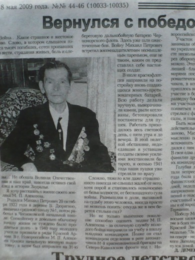 Мой дед - ветеран Великой Отечественной Войны-Алексеев Михаил Петрович. В 18 лет был призван в армию. В Новороссийске 1940 года началась его военная служба матросом на артиллерийской батарее береговой обороны Черноморского флота. А через год началась война. Здесь он встретил первые дни войны,защищая береговую линию полуострова. Затем приказ отбыть в школу командиров, а через полтора года в составе 81 бригады морской пехоты Дед воевал уже на Кавказе.