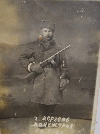 Призван в ряды Красной Армии в 1939г. В г. Благовещенск, в 1941 году началась Великая Отечественная война. Охранял рубежи СССР на Дальнем Востоке, воевал с Японией, имеет награды: медаль " За Отвагу", орден "Отечественной войны 2 степени", медаль " За победу над Японией", благодарность от И. Б. Сталина, подписана командиром 57 стрелкового Омского ордена "Красной Звёзды" полка, подполковником Скромным. Служил и воевал 7 лет. Был разведчик- водолаз на реке Амур, после войны обучал новобранцев. Вернулся на свою Родину. Получал все юбилейные медали. Дожил до 72 лет