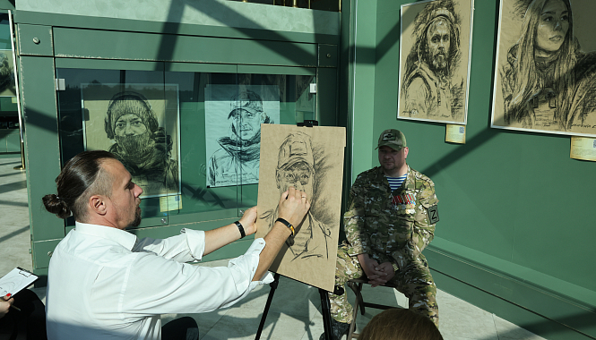 В рамках открытия выставки состоялся мастер-класс, который провел сам Сергей Марченко. Художник вместе с юнармейцами создал портрет участника СВО Дмитрия Лебедева, раскрыв юным художникам тонкости и секреты угольной графики.